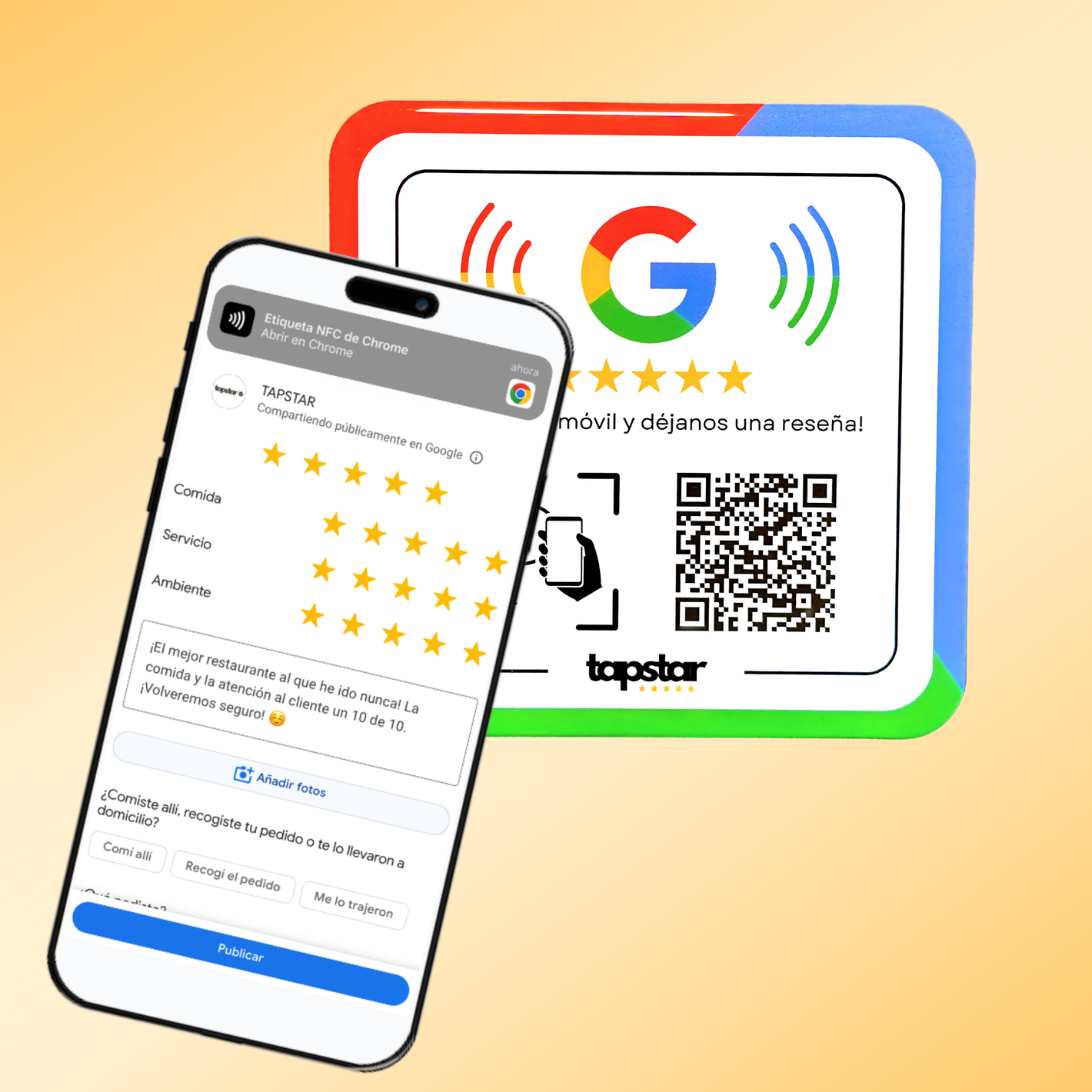Conectado a las reseñas en Google de tu negocio, hace que tus clientes puedan dejarte su reseña de 5 estrellas acercando el móvil o escaneando el QR.